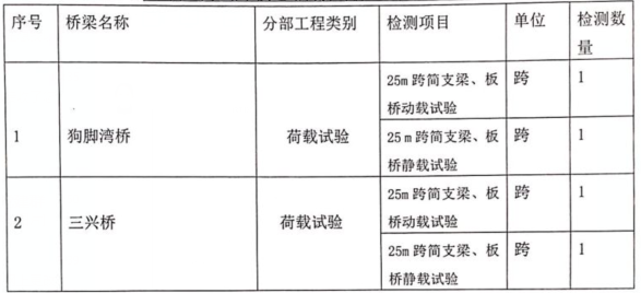 2.項目內(nèi)容:對碧峰峽路下段道路狗腳灣橋、三興橋進(jìn)行動、靜荷載試驗。