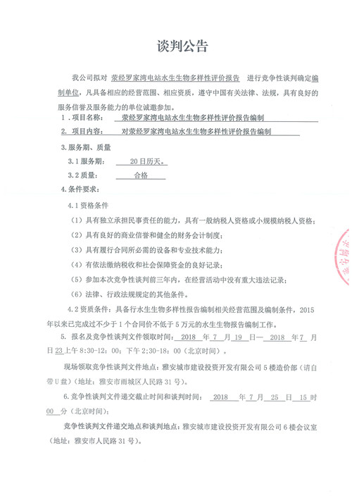 滎經(jīng)羅家灣電站水生生物多樣性評價報告編制——競爭性談判