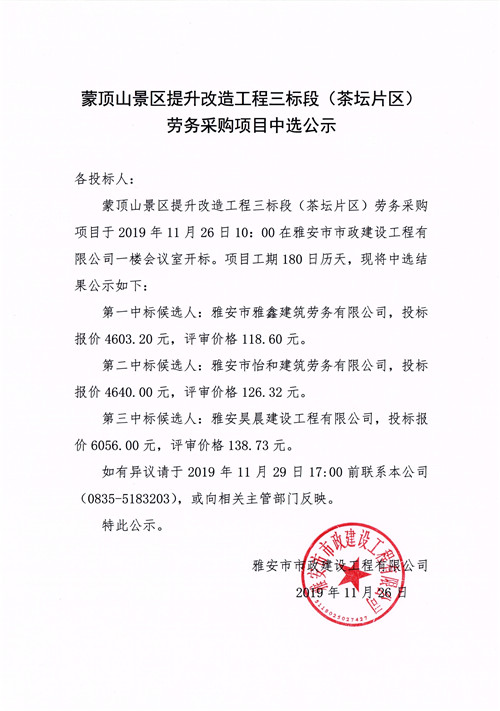 蒙頂山景區(qū)提升改造工程三標段(茶壇片區(qū))勞務(wù)采購項目招標中選公示