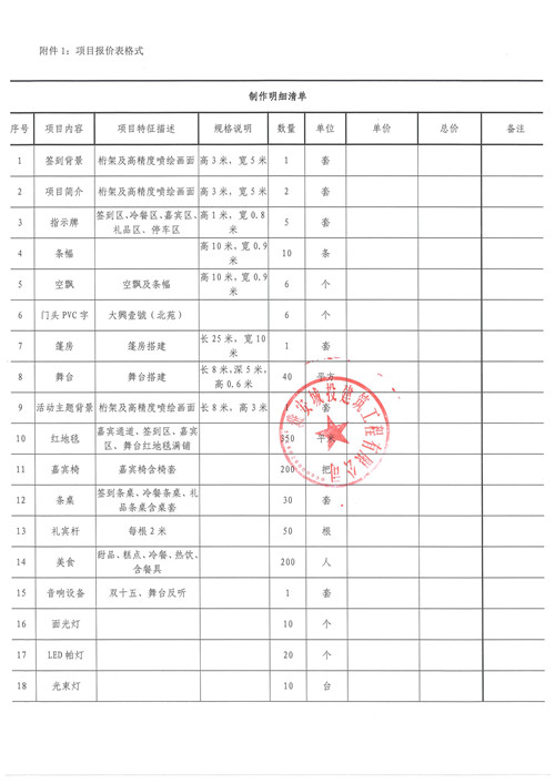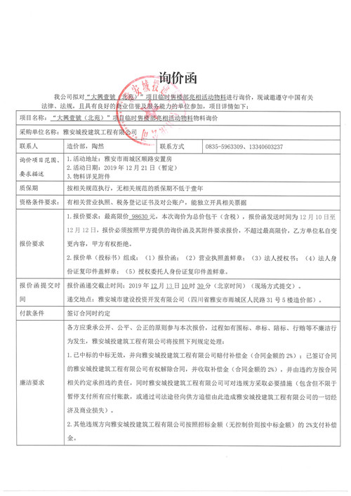 大興壹號(hào)(北苑)項(xiàng)目臨時(shí)售樓部亮相活動(dòng)物料詢價(jià)函