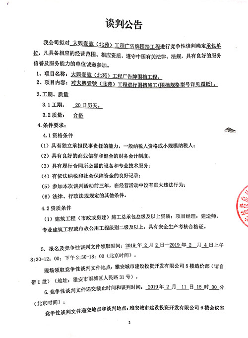 大興壹號(hào)(北苑)工程廣告牌圍擋工程競(jìng)爭(zhēng)性談判公告