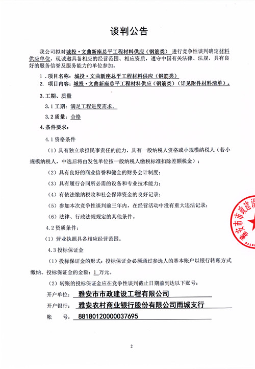 市政公司城投·文曲新座總平工程材料供應(yīng)(鋼筋類)競(jìng)爭(zhēng)性談判公告