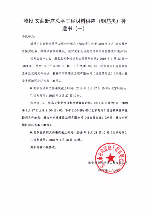 城投·文曲新座總平工程材料供應(鋼筋類)競爭性談判公告補遺一