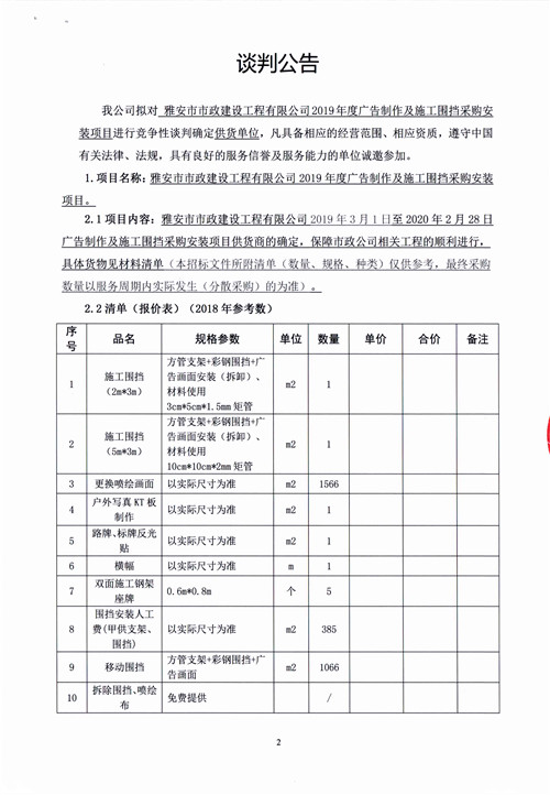 市政公司2019年度廣告制作及施工圍擋采購安裝項(xiàng)目競爭性談判公告