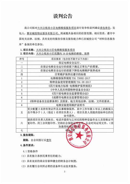 大興公租房小區(qū)電梯維保服務項目的競爭性談判公告