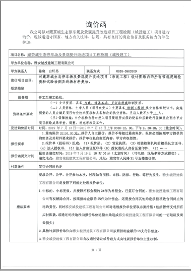 藏茶城生態(tài)停車場及景觀提升改造項目工程檢測詢價函