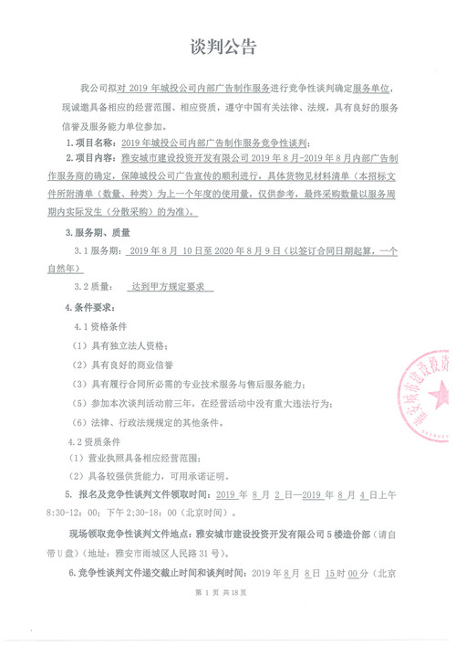 2019年城投公司內部廣告制作服務競爭性談判公告