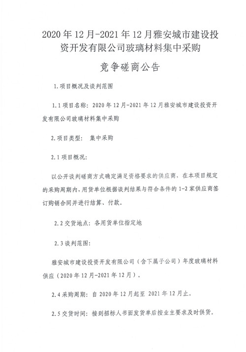 2020年12月-2021年12月雅安城市建設(shè)投資開發(fā)有限公司玻璃材料集中采購(gòu)競(jìng)爭(zhēng)磋商公告