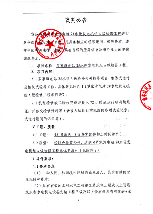 羅家灣電站2#水輪發(fā)電機(jī)組A級(jí)檢修工程談判公告