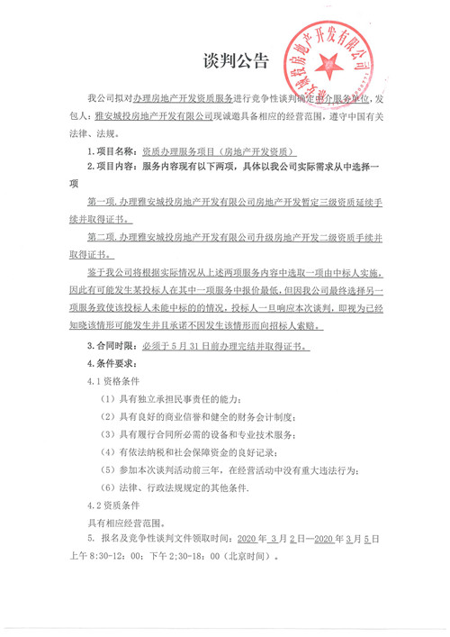 城投地產公司辦理房地產開發(fā)資質服務確認中介服務單位的競爭性談判公告