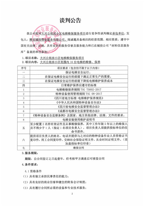 城投物業(yè)公司大興公租房小區(qū)電梯維保服務(wù)項(xiàng)目競爭性談判公告(第二次)