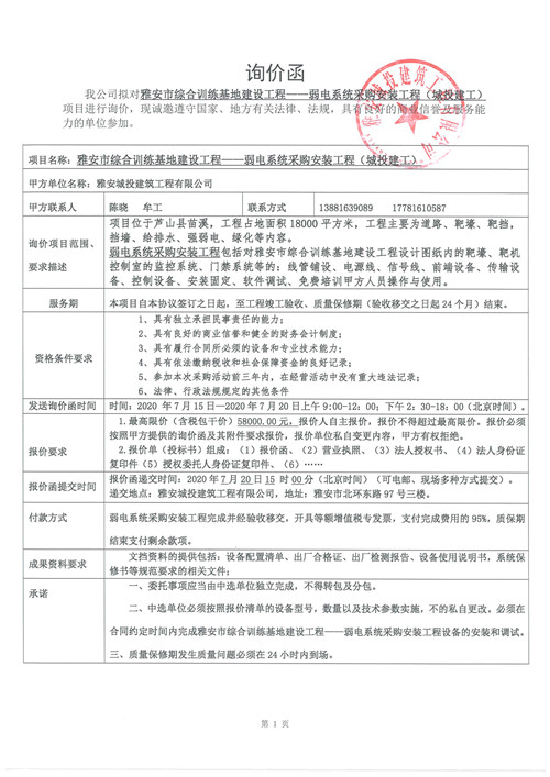 城投建工公司雅安市綜合訓(xùn)練基地建設(shè)工程——弱電系統(tǒng)采購安裝工程詢價函