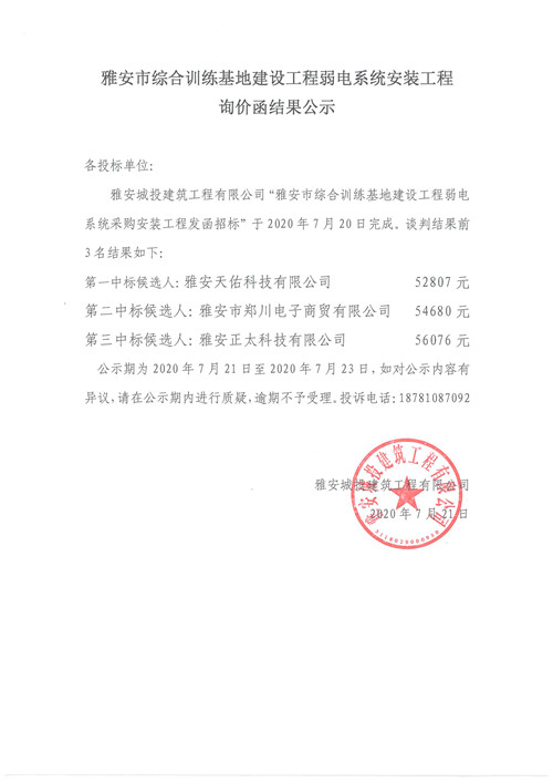 雅安市綜合訓(xùn)練基地建設(shè)工程弱電系統(tǒng)安裝工程詢價(jià)函結(jié)果公示