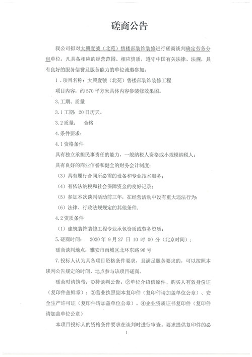 城投建工大興壹號(hào)(北苑)售樓部裝飾裝修磋商公告