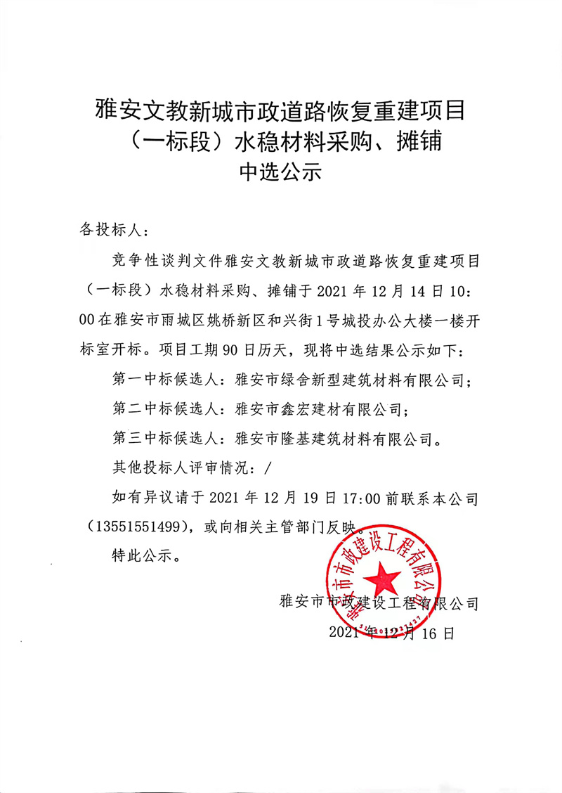 雅安文教新城市政道路恢復(fù)重建項目(一標(biāo)段)水穩(wěn)層材料采購、攤鋪中選公示