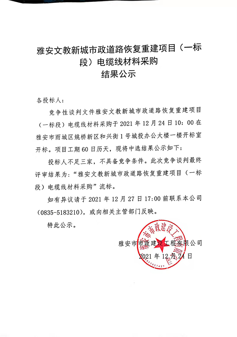 雅安文教新城市政道路恢復(fù)重建項目(一標(biāo)段)電纜線材料采購結(jié)果公示