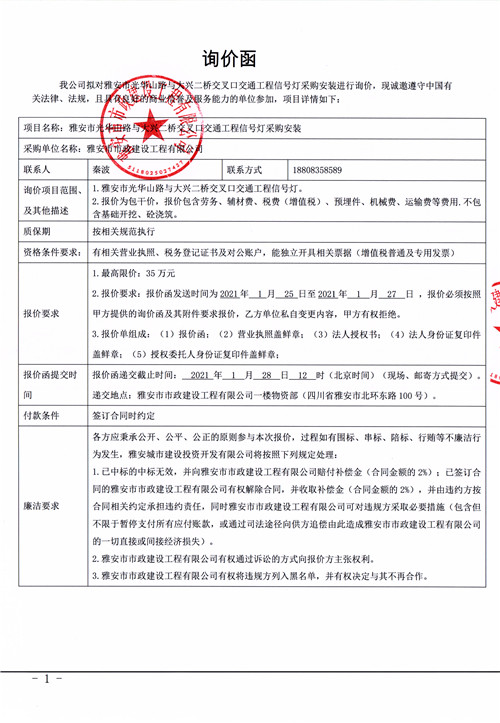 雅安市市政建設(shè)工程有限公司雅安市光華山路與大興二橋交叉口交通工程信號燈采購安裝詢價(jià)函
