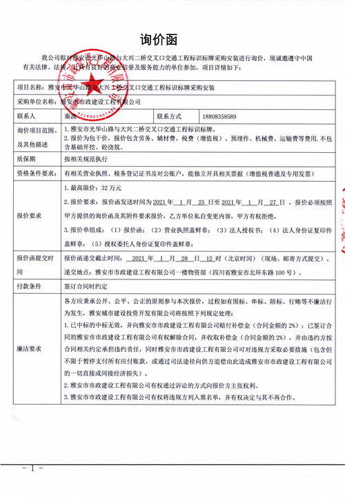 雅安市市政建設(shè)工程有限公司雅安市光華山路與大興二橋交叉口交通工程標(biāo)識標(biāo)牌采購安裝詢價函