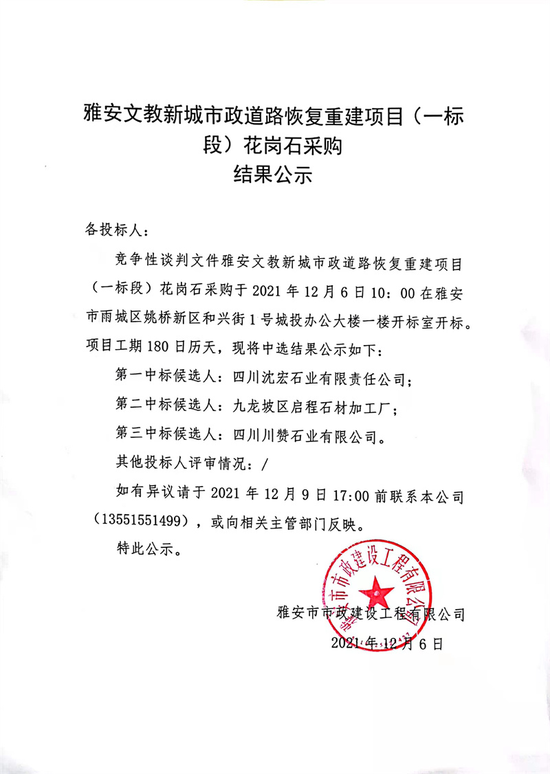 雅安文教新城市政道路恢復(fù)重建項(xiàng)目(一標(biāo)段)花崗石采購(gòu)結(jié)果公示