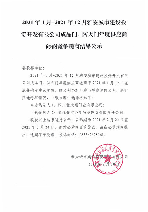 2021年1月-2021年12月雅安城市建設投資開發(fā)有限公司成品門、防火門年度供應商磋商競爭磋商結果公示