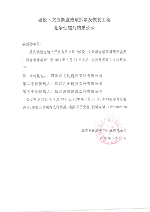 城投·文曲新座樓頂拆除及恢復(fù)工程競爭性磋商結(jié)果公示