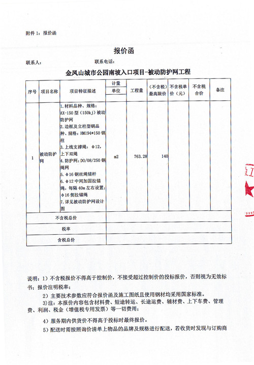 雅安市政公司金鳳山公園南坡入口項目-被動防護網(wǎng)材料詢價函