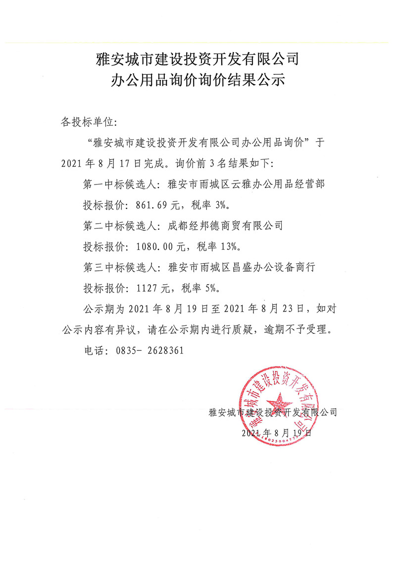 城投公司辦公用品詢價結(jié)果公示