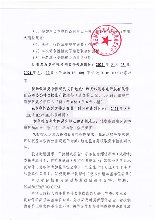城利水電公司滎經(jīng)縣羅家灣電站大壩注冊(cè)登記工作相關(guān)資料編制競(jìng)爭(zhēng)性談判公告(第二次)
