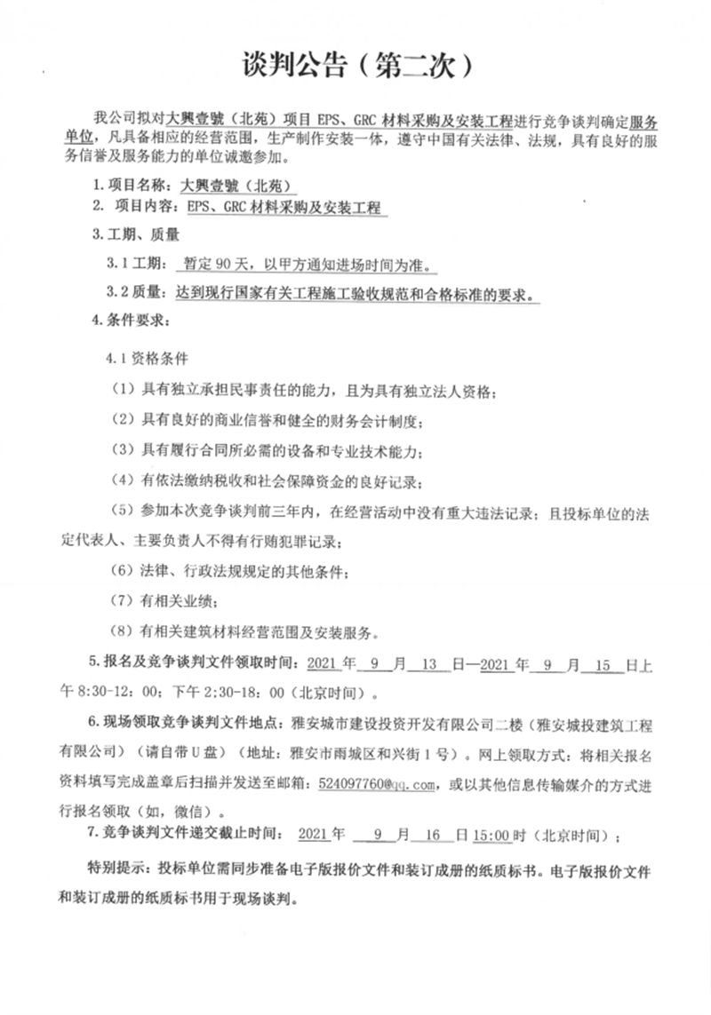 大興壹號(北苑)項目EPS、GRC材料采購及安裝工程競爭談判公告(第二次)