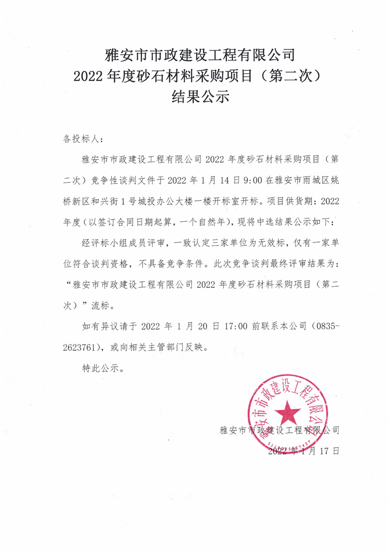 雅安市市政建設工程有限公司2022年度砂石材料采購項目(第二次)結果公示