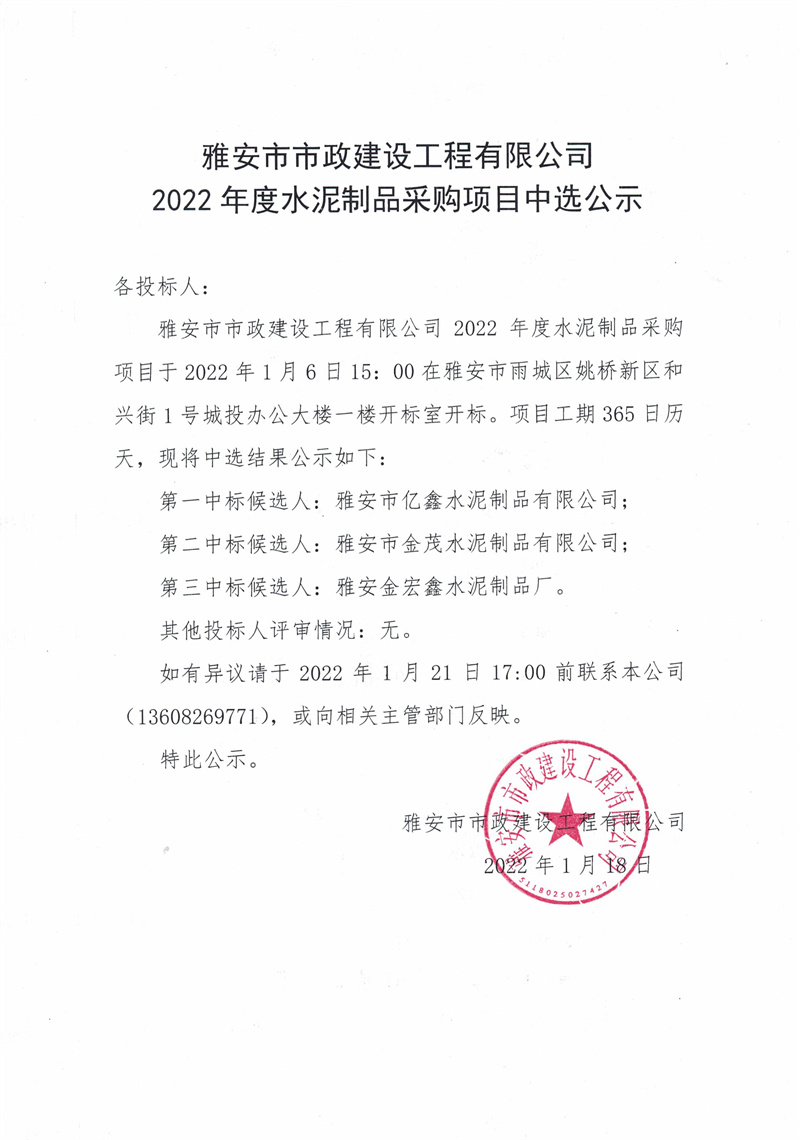 市政公司2022年度水泥制品采購項(xiàng)目中選公示