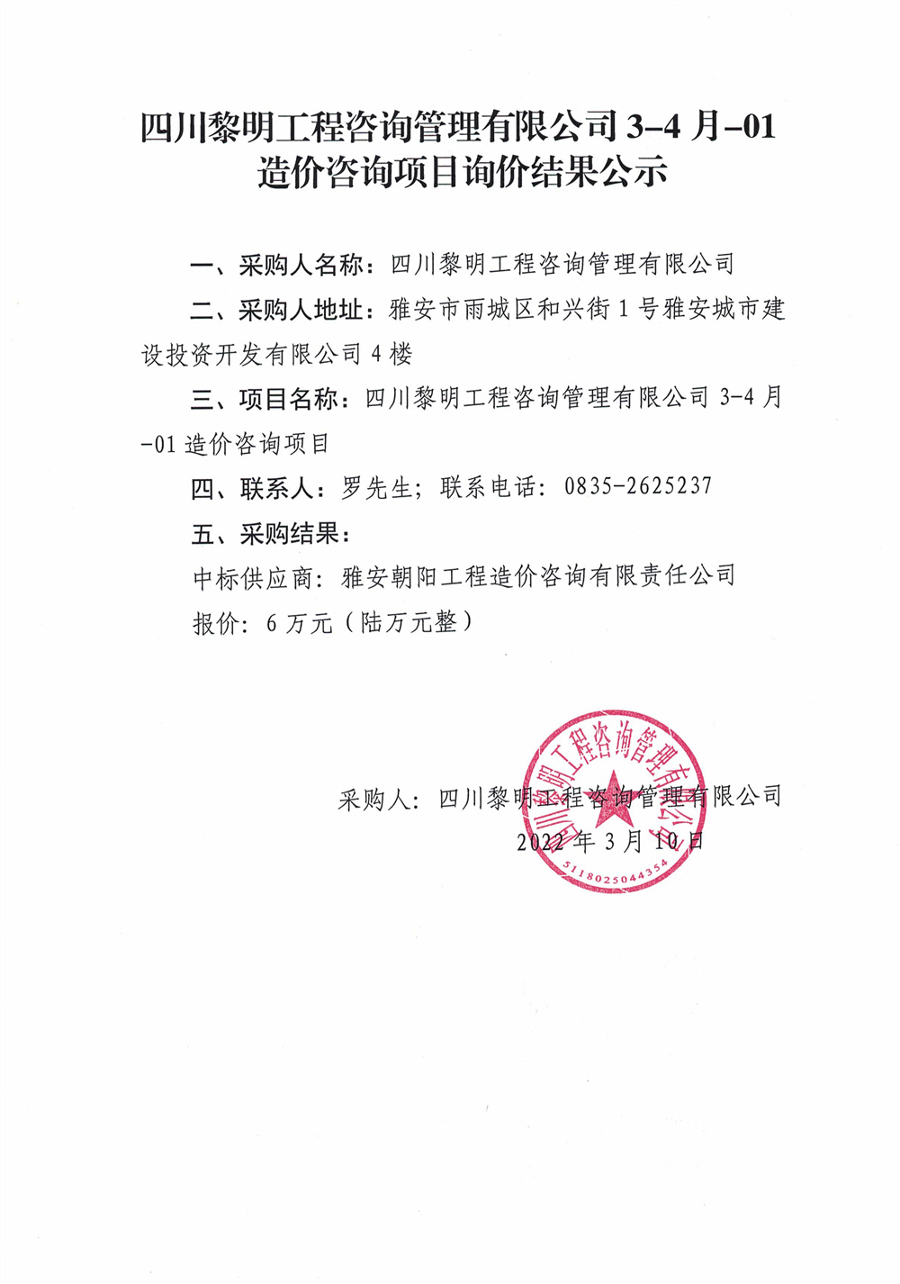四川黎明工程咨詢管理有限公司3-4月-01造價咨詢項目詢價結果公示