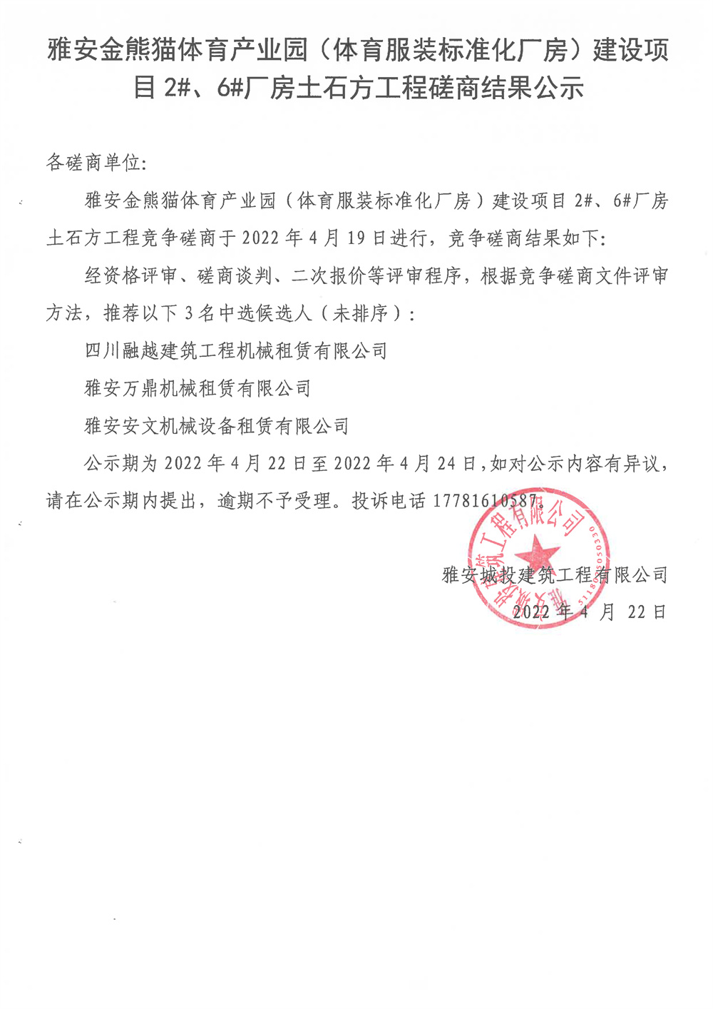 雅安金熊貓?bào)w育產(chǎn)業(yè)園(體育服裝標(biāo)準(zhǔn)化廠房)項(xiàng)目2#6#廠房土石方工程磋商結(jié)果公示