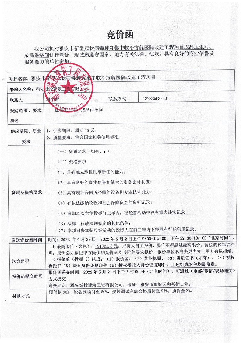 雅安市新型冠狀病毒肺炎集中收治方艙醫(yī)院改建工程項(xiàng)目成品衛(wèi)生間、淋浴間競(jìng)價(jià)函