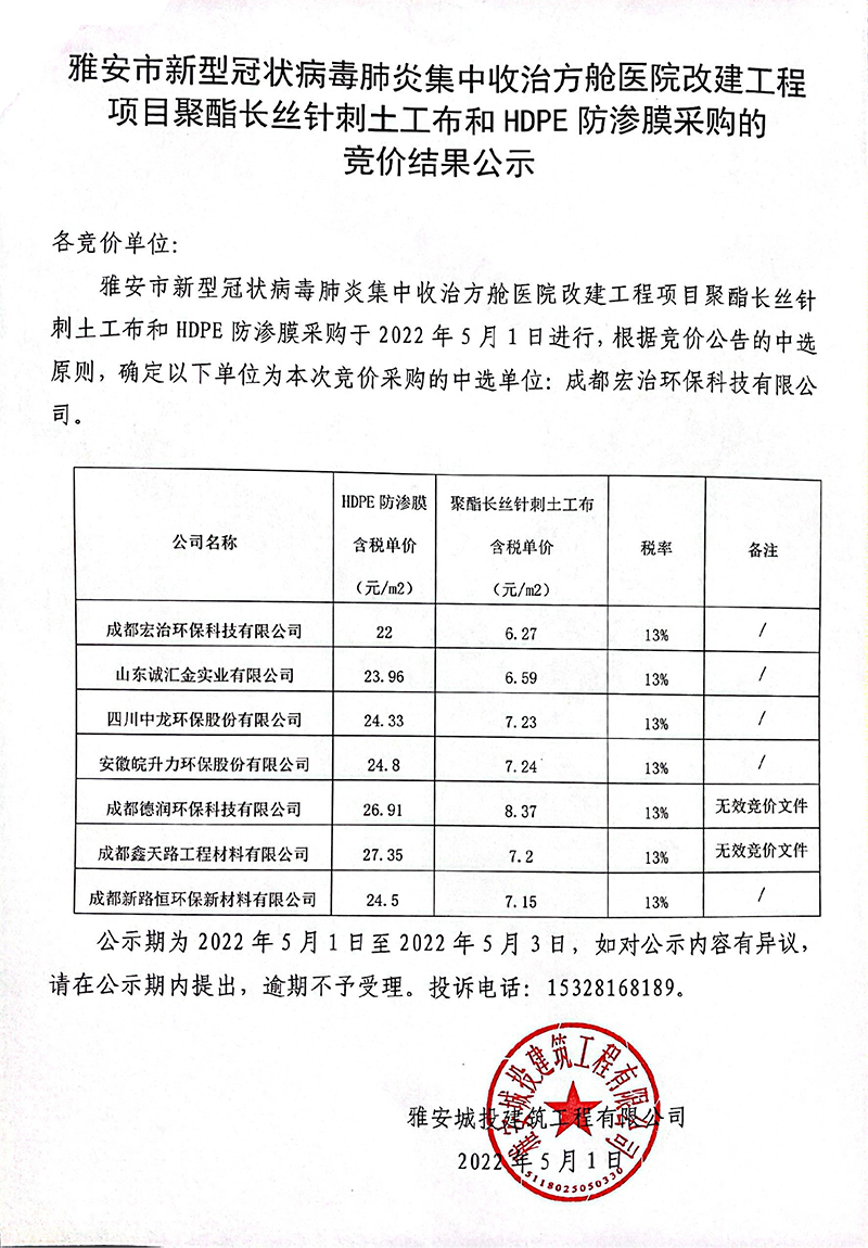 關(guān)于雅安市新型冠狀病毒肺炎集中收治方艙醫(yī)院改建工程項(xiàng)目聚酯長絲針刺土工布和HDPE防滲膜采購的競(jìng)價(jià)結(jié)果公示
