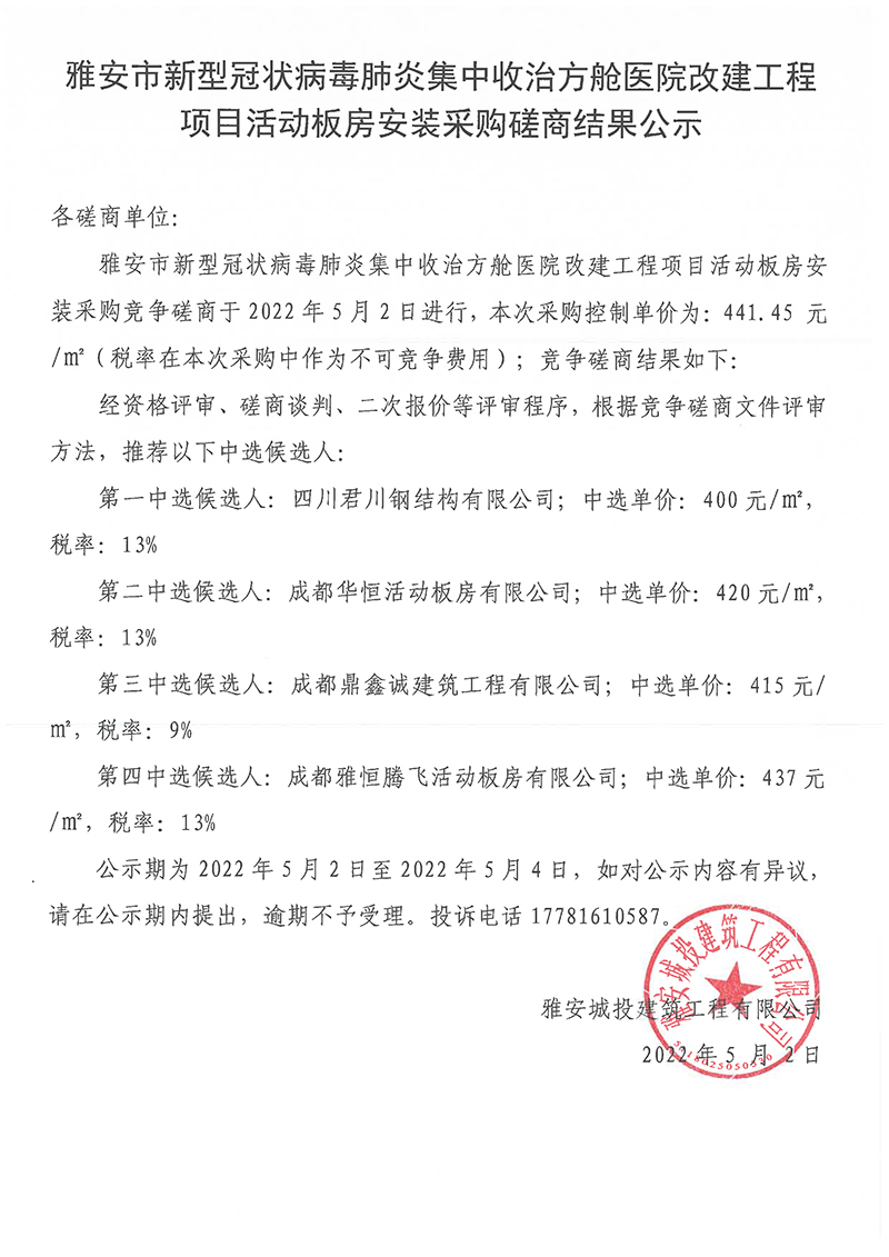 雅安市新型冠狀病毒肺炎集中收治方艙醫(yī)院改建工程項(xiàng)目活動板房安裝采購磋商結(jié)果公示