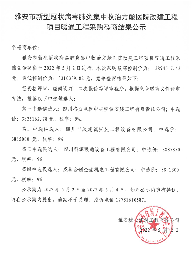 雅安市新型冠狀病毒肺炎集中收治方艙醫(yī)院改建工程項目暖通工程采購磋商結(jié)果公示
