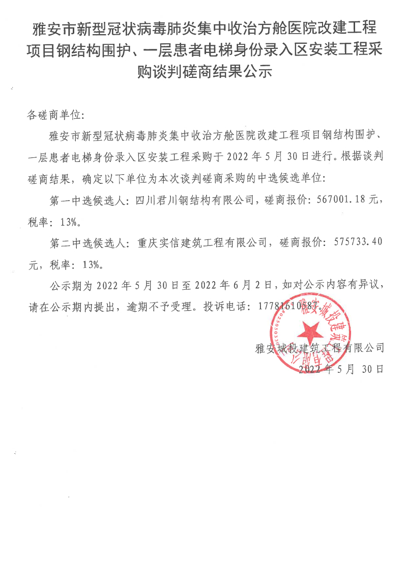 雅安市新型冠狀病毒肺炎集中收治方艙醫(yī)院改建工程項(xiàng)目鋼結(jié)構(gòu)圍護(hù)、一層患者電梯身份錄入?yún)^(qū)安裝工程采購(gòu)談判磋商結(jié)果公示