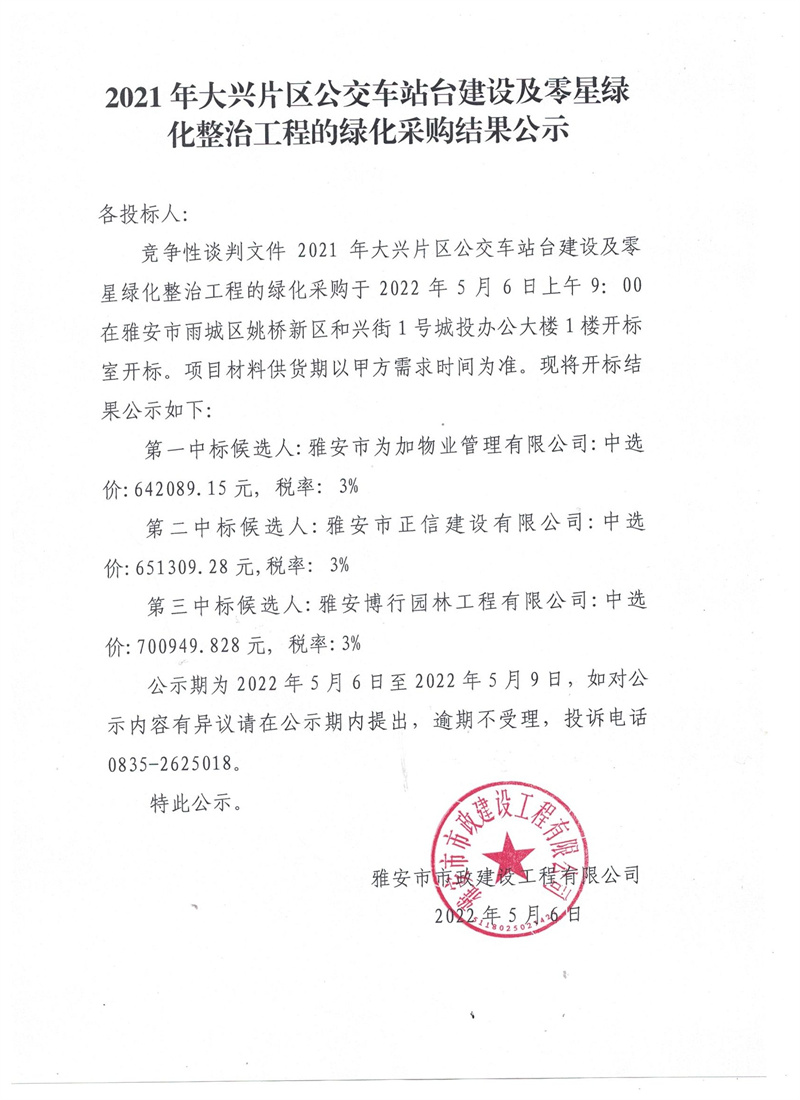 2021年大興片區(qū)公交站臺(tái)建設(shè)及零星綠地整治工程的綠化采購結(jié)果公示