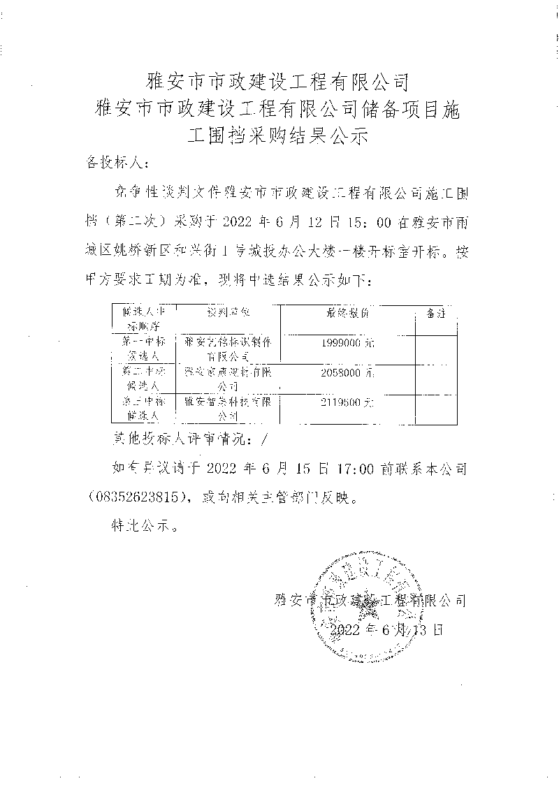 雅安市市政建設(shè)工程有限公司儲備項目施工圍擋招采結(jié)果公示