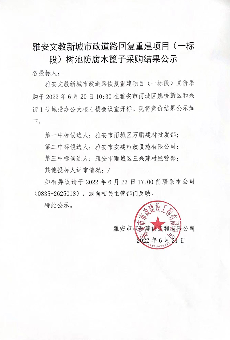 雅安市文教新城市政道路恢復(fù) 重建項目工程(一標(biāo)段)樹池防腐木篦子采購結(jié)果公示