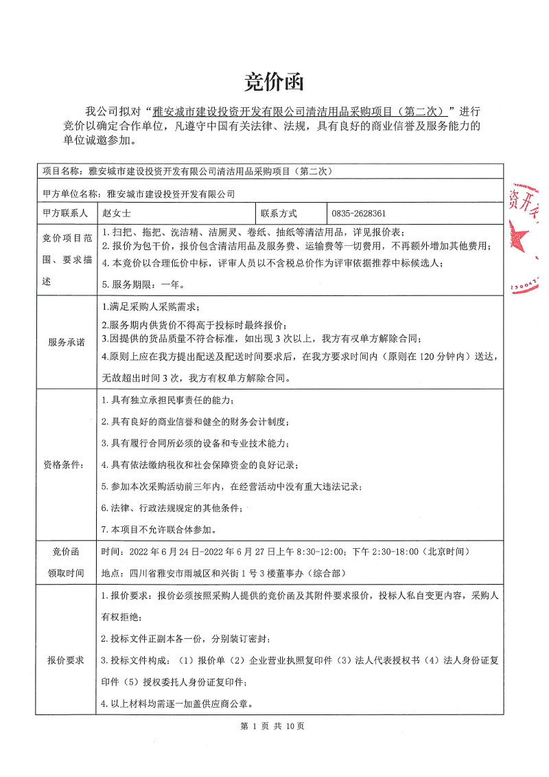 雅安城市建設(shè)投資開(kāi)發(fā)有限公司 清潔用品采購(gòu)項(xiàng)目(第二次)競(jìng)價(jià)公告