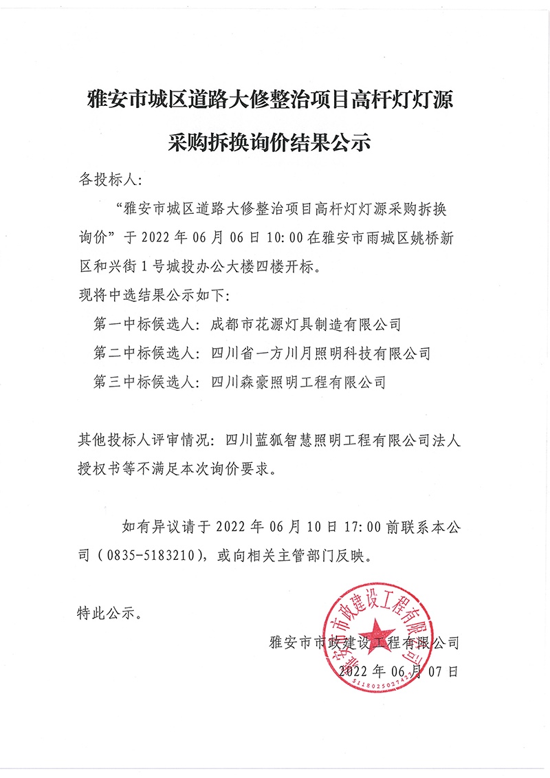 雅安市城區(qū)道路大修整改項目高桿燈燈源采購拆換詢價結果公示