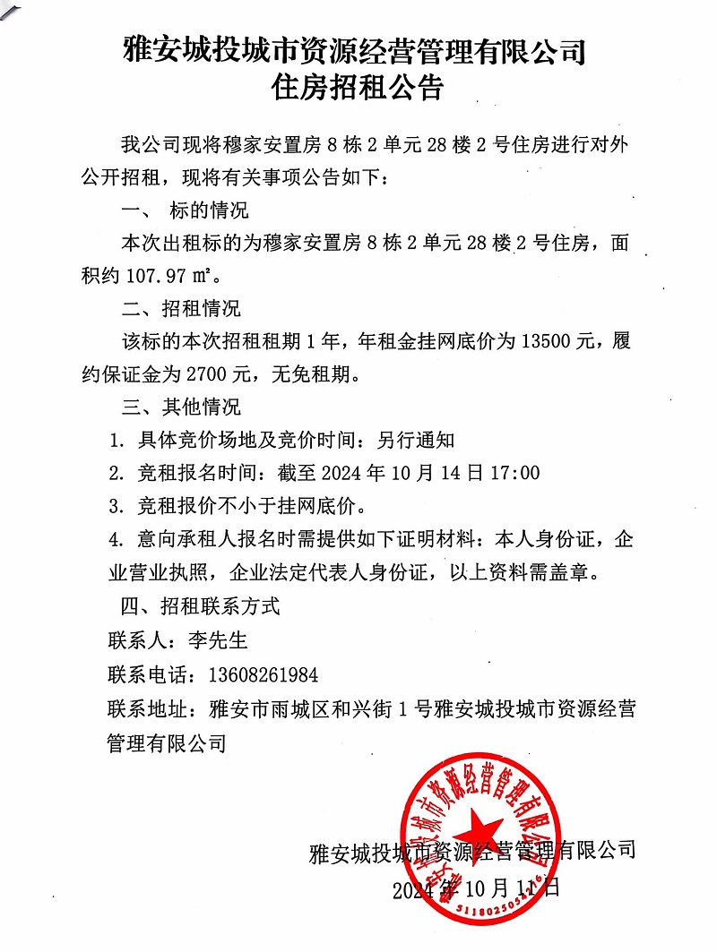 雅安城投城市資源經(jīng)營管理有限公司關于穆家安置房8棟2單元28樓2號住房招租公告