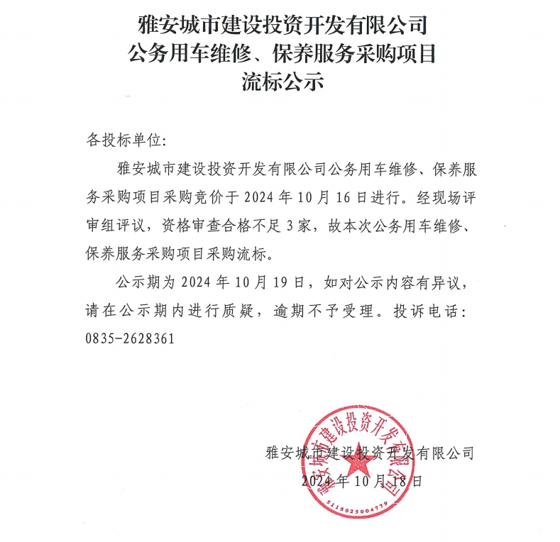 雅安城市建設(shè)投資開發(fā)有限公司公務(wù)用車維修、保養(yǎng)服務(wù)采購項目流標(biāo)公示