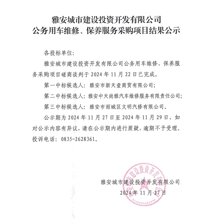 雅安城市建設(shè)投資開發(fā)有限公司公務(wù)用車維修、保養(yǎng)服務(wù)采購(gòu)項(xiàng)目結(jié)果公示