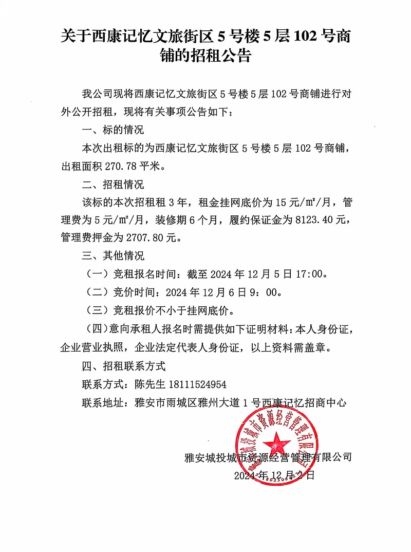關于西康記憶文旅街區(qū)5號樓5層102號商鋪的招租公告
