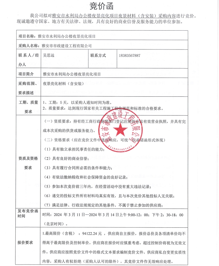 雅安市水利局辦公樓夜景亮化項目夜景材料(含安裝)采購內容競價公告