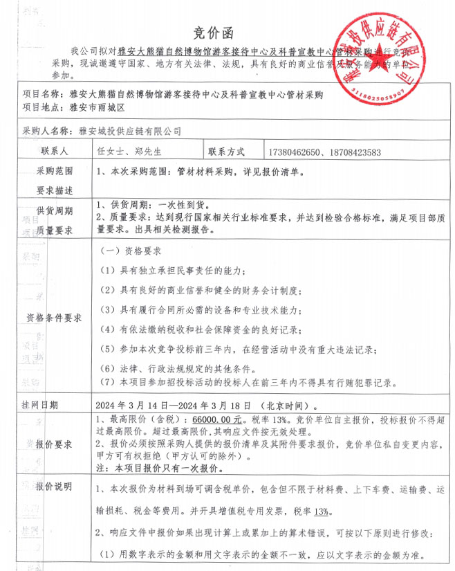 雅安大熊貓自然博物館游客接待中心及科普宣教中心管材采購(gòu)競(jìng)價(jià)公告