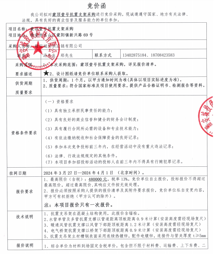 蒙頂壹號抗震支架采購競價公告